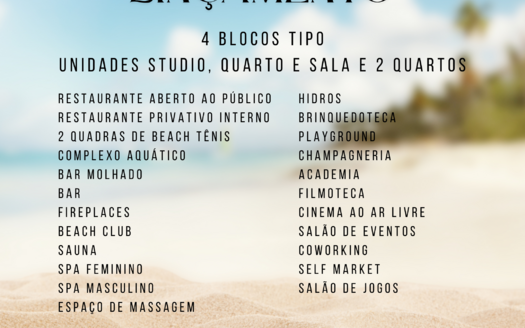 Empreendimento que conta com diversas áreas de lazer, alto padrão em uma das praias mais paradisíacas de Pernambuco. Conta com 7 blocos, e opções de studios e apartamentos com 2 quartos.